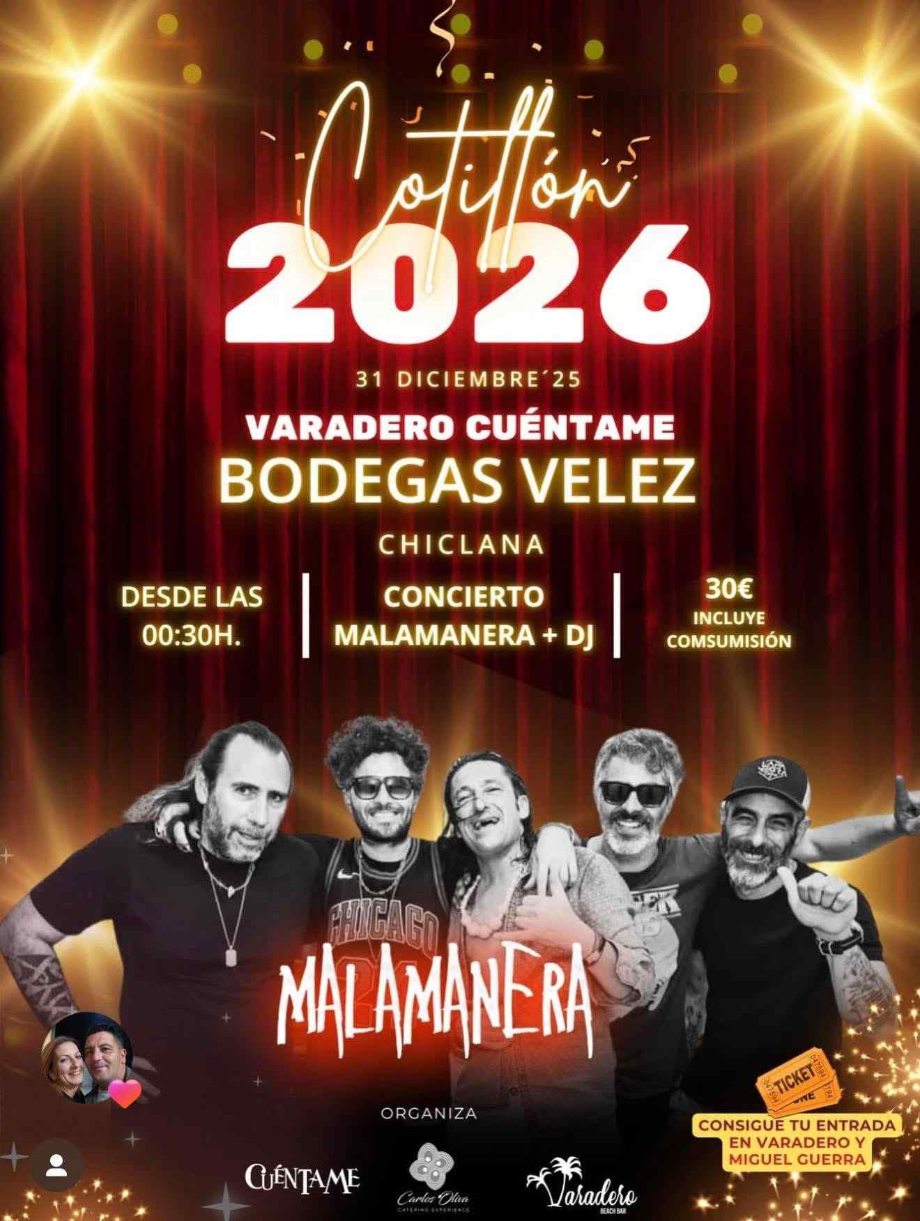 Las Bodegas Vélez serán el escenario del Cotillón de Año Nuevo después de las Campanadas. A partir de las 00:30 horas, tendrá lugar esta fiesta organizada por Varadero, Cuéntame y Celebraciones Carlos Oliva, que contará con la actuación de Malamanera y la presencia de un DJ. Las entradas están disponibles a un precio de 30 euros, con consumición incluida. Las entradas se podrán adquirir en la Bodega de Miguel Guerra y Varadero Beach Bar (sit...