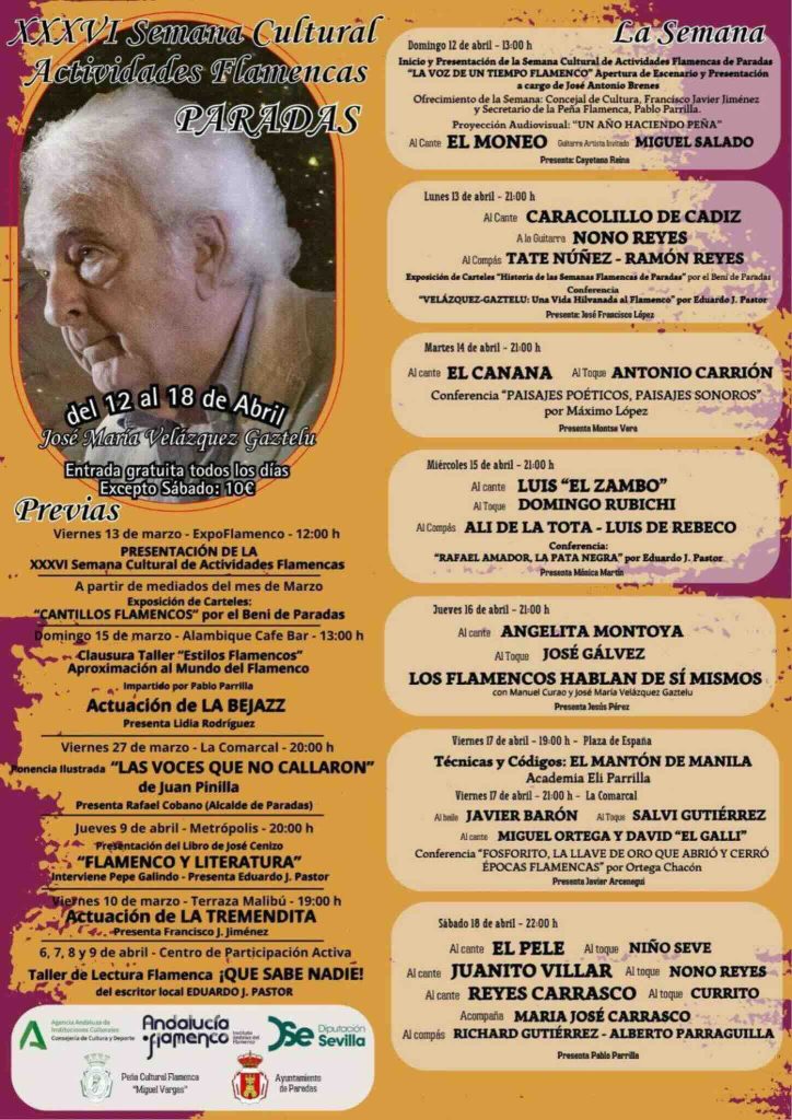 Hola. Tengo que estar orgulloso de mis paisanos de Paradas (Sevilla), porque llevan ya nada más y nada menos que treinta y seis años, ediciones de la Semana de Actividades flamencas, del 12 al 16 de abril, y desde antes con sesiones previas, todo un referente según dice la crítica flamenca. Así lo entiendo por su calidad constante, como la de este año, no falta ese nivel excelente. Para mí es un honor, que agradezco, a los organizadores, el estar este año en las jornadas previas, con la presentación, en el ciclo Flamenco y Literatura, de mi libro Poeta flamenco. Cómo hacer letras para el cante, de Colibrí Ediciones, donde podéis adquirirlo, si os interesa, además de por librerías cercanas, https://colibriediciones.es/producto/poeta-flamenco/