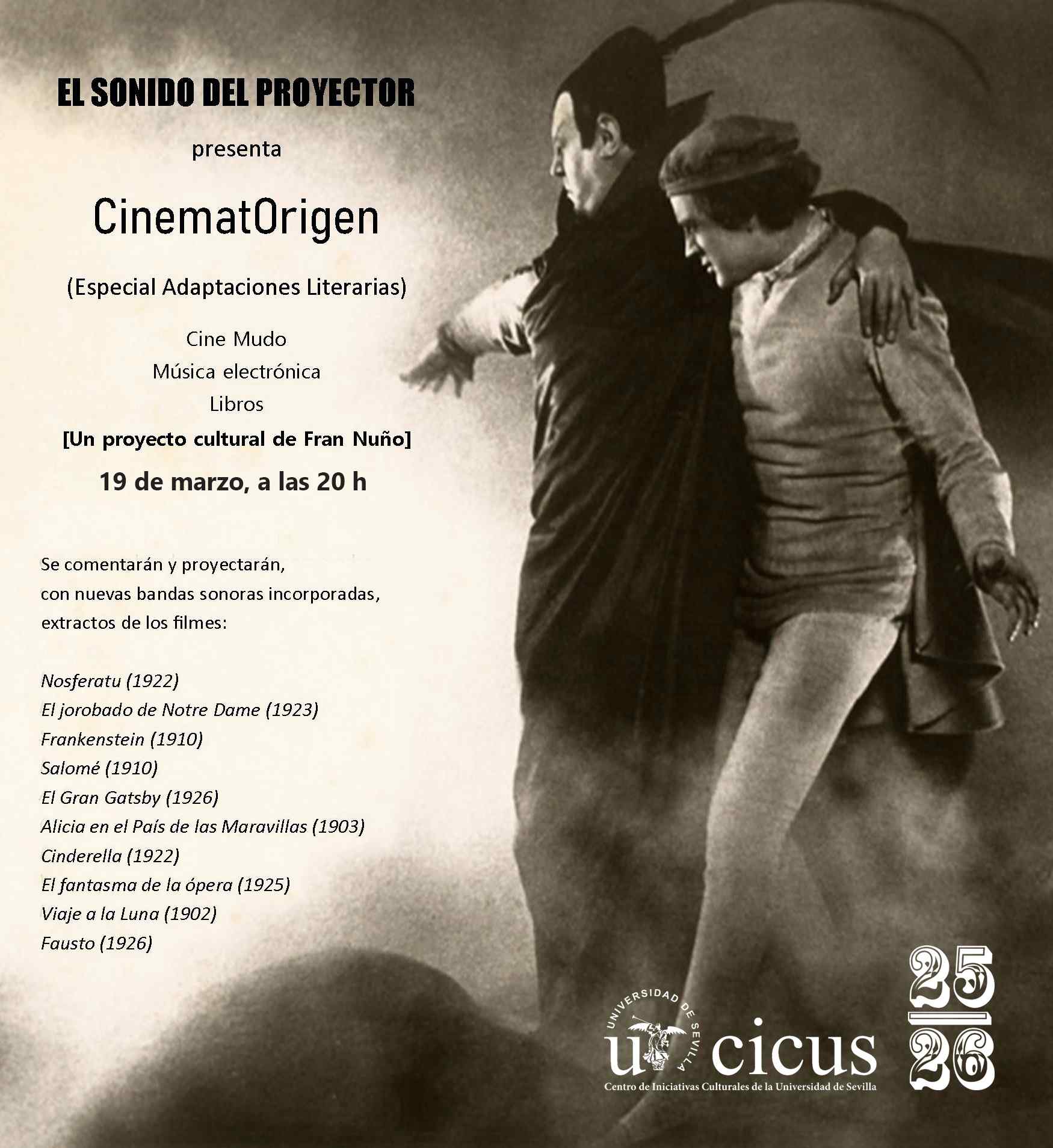 El Sonido del Proyector, un proyecto cultural de Fran Nuño donde se unen cine mudo, música electrónica y libros, presenta el acto CinematOrigen (Especial adaptaciones literarias), en el que se realizará un recorrido por distintas obras clásicas de la literatura que fueron llevadas a la gran pantalla en los orígenes del cine. Las proyecciones de extractos de dichas películas estarán acompañadas de su correspondiente presentación y de nuevas bandas sonoras creadas con música electrónica por el propio Nuño, además de recomendaciones de libros relacionados con los filmes seleccionados.