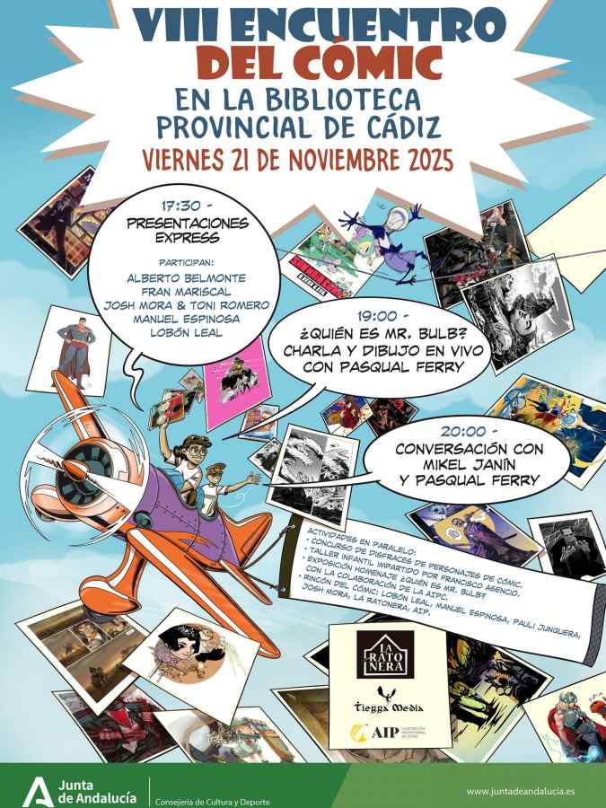 El VIII Encuentro del Cómic comenzará con una dinámica ronda de presentaciones protagonizadas por autores gaditanos. Se contará con la presencia de dos destacados autores como Pasqual Ferry y Mikel Janín, que conversarán sobre sus últimas creaciones y la situación del sector. Además habrá espacios para otros autores y sellos editoriales, concurso de disfraces y taller de cómic para los más pequeños.