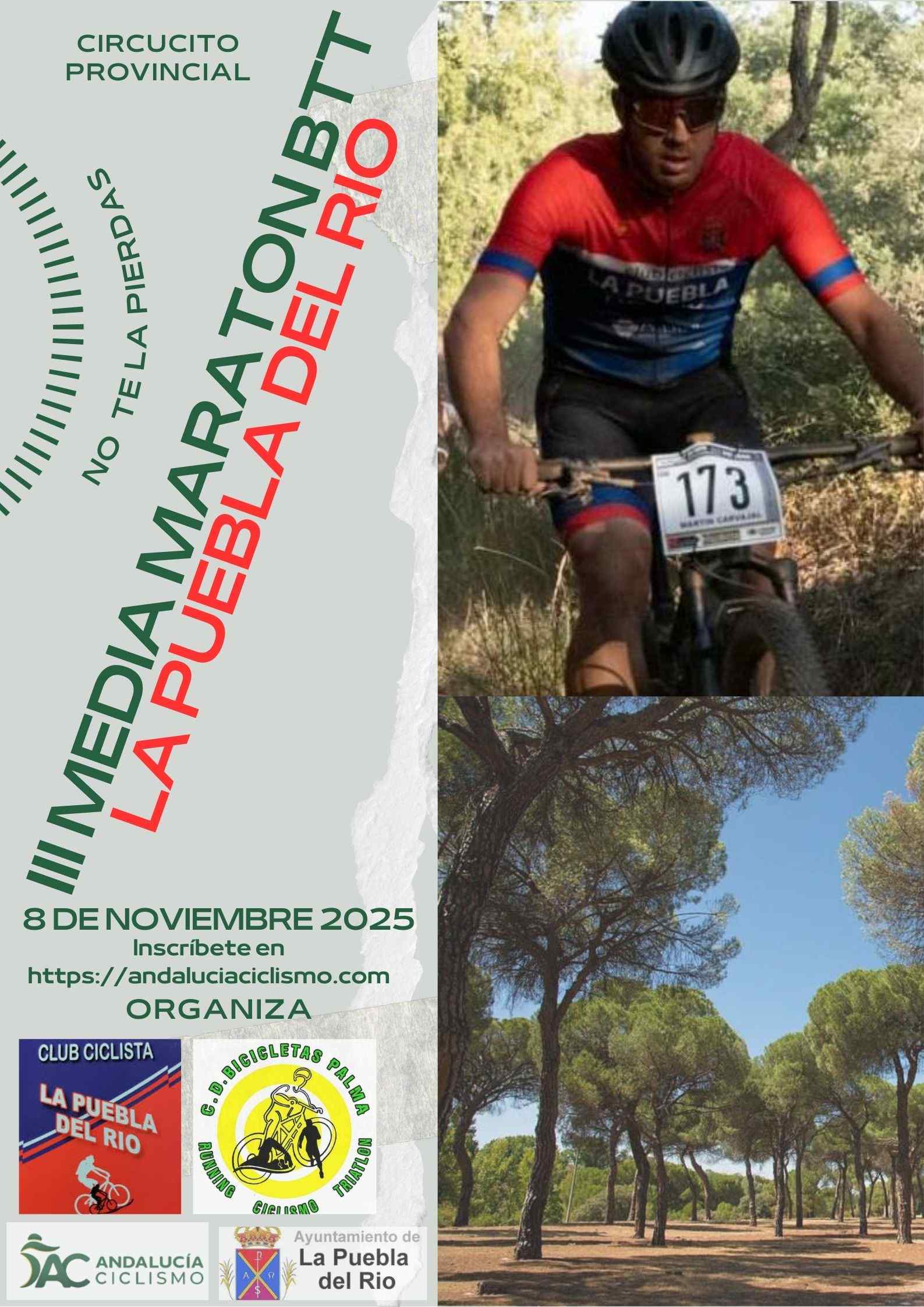El Circuito Provincial de Sevilla BTT Media Maratón 2025 concluye en La Puebla del Río con la celebración de la III Media Maratón La Puebla del Río, última prueba puntuable del calendario. Organizada por el C.C. BTT La Puebla del Río, la cita definirá las clasificaciones finales y proclamará a los campeones provinciales tras un total de nueve encuentros.