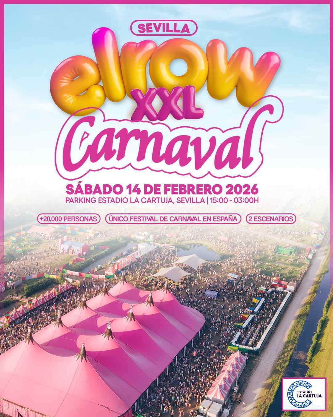 Después de su última visita en 2024, elrow regresa a Sevilla con una propuesta totalmente renovada: un Carnaval XXL que tomará los exteriores del Estadio La Cartuja el 14 de febrero. El evento espera reunir a 20.000 personas, reafirmando a Sevilla como una de las ciudades clave para la marca en España. Una producción masiva que mezcla Carnaval, música electrónica y un despliegue artístico único. Y que acogerá a 20.000 personas.