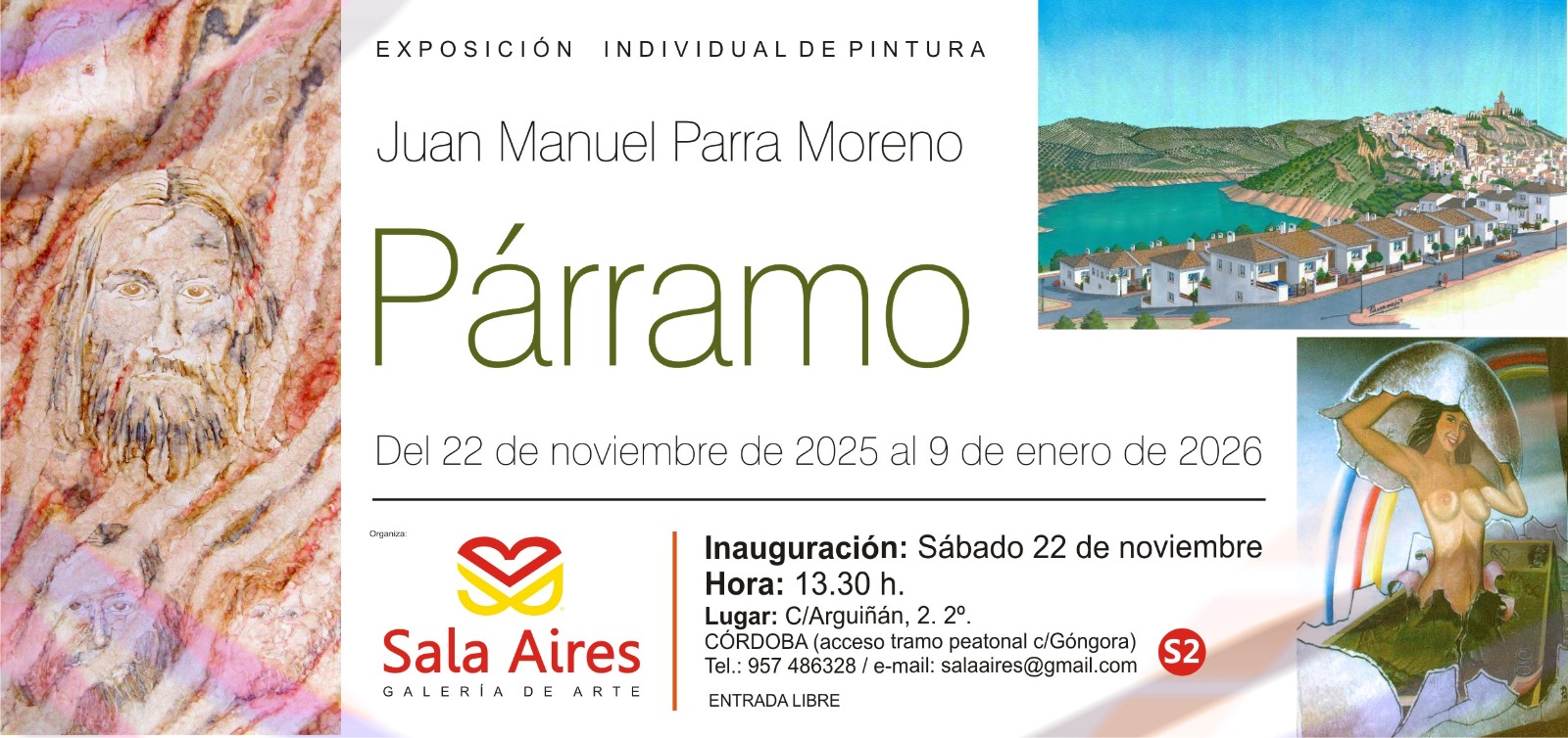Exposición individual de la artista Juan Manuel Parra Moreno "PÁRRAMO" compuesta por 20 obras con una variedad de técnicas utilizadas: óleo, acrílico, aerógrafo o técnica mixta. Con una amplia gama de colores y tonalidades de su paleta y sus texturas. Llama la atención la serie de cuadros texturizados como motivos marmóreos y con gran barniz.