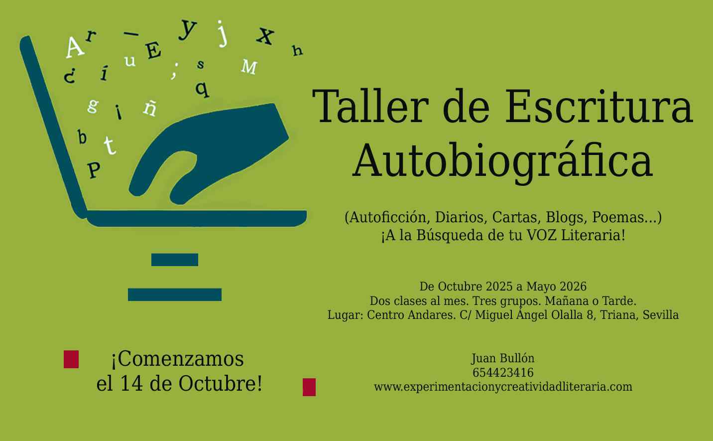Taller de Escritura Autobiográfica (Auto-ficción, Diarios, Poemas, Blogs). Dos clases al mes. Martes y jueves de 11 a 13 horas. O miércoles de 19.30 a 21.30 horas. Grupos reducidos. En Triana, Sevilla.