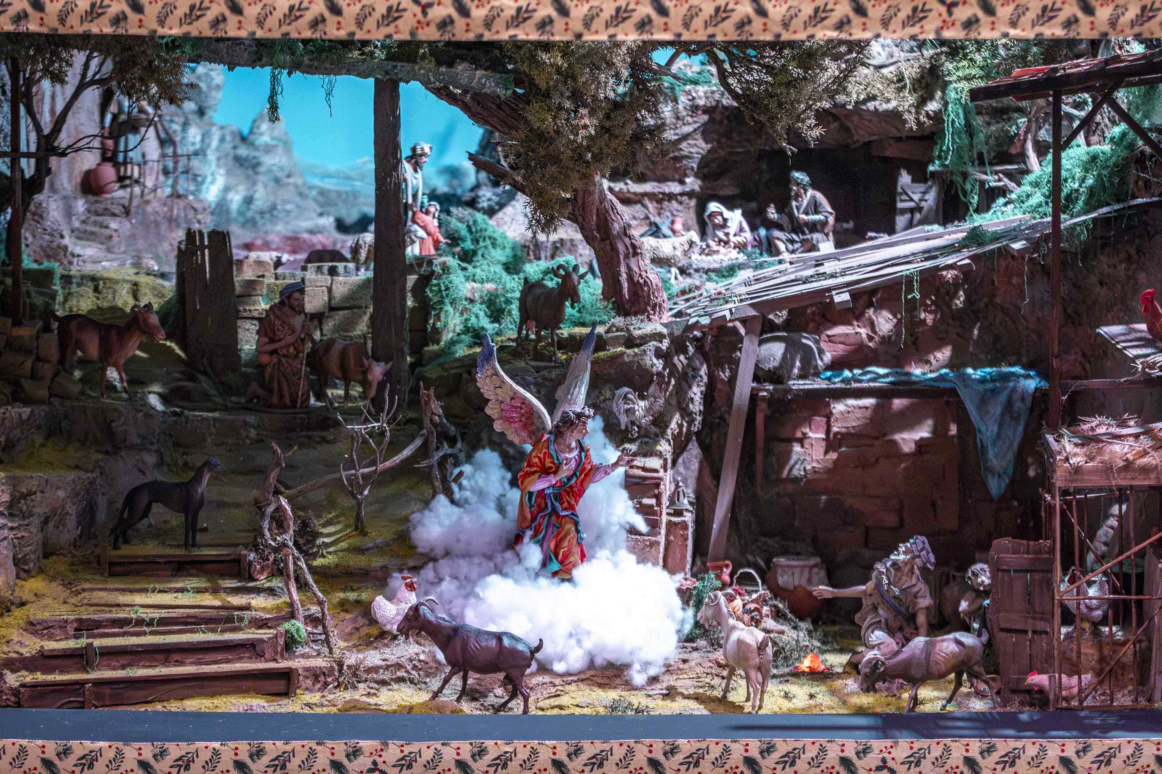 Museo de Artes y Costumbres Populares (Málaga): Belén artesanal de Enrique Haro, con escenas de la Natividad, Reyes Magos y Anuncio a los pastores.