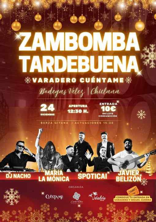 Uno de los eventos organizado por el Ayuntamiento de Chicalana es la Zambomba ‘Tardebuena’, que se celebrará el 24 de diciembre a partir de las 12:30 horas, con una degustación de Berza Gitana. Las actuaciones comenzarán a las 15:30 horas. Durante la fiesta, se podrá disfrutar de las actuaciones de María La Mónica, Spoticai, Javier Belizón y Dj Nacho. Las entradas, con una consumición incluida, se podrán conseguir en Varadero Beach Bar (situado en el centro comercial Bellamar) y en la Bodega de Miguel Guerra.