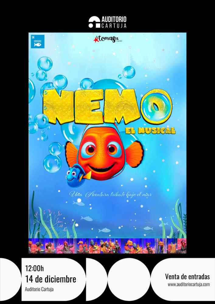 Nemo, el musical es un espectáculo original basado en las aventuras de este personaje a través del océano y los amigos. Nemo, el musical es un espectáculo original basado en las aventuras de este personaje a través del océano y los amigos. Nuestro protagonista acaba de nacer en su anémona rodeado de todos los animales marinos: tortugas, Nuestro protagonista acaba de nacer en su anémona rodeado de todos los animales marinos: tortugas, medusas, caballitos de mar, pulpos… Y ya se ve inmerso en medusas, caballitos de mar, pulpos… Y ya se ve inmerso en la mayor aventura que vivirá jamás: salvar el mar del mayor de sus enemigos. Por suerte tiene la ayuda y el apoyo la mayor aventura que vivirá jamás: salvar el mar del mayor de sus enemigos. Por suerte tiene la ayuda y el apoyo de todos ellos y además de una nueva amiga, Dori. de todos ellos y además de una nueva amiga, Dori. Un proyecto que incluye la temática del cuidado de los océanos y la contaminación ambiental de plástico incluida en la Agenda 2030. Un proyecto que incluye la temática del cuidado de los océanos y la contaminación ambiental de plástico incluida en la Agenda 2030… Con voces en directo y una preciosa escenografía este espectáculo llega por primera vez llega a España para… Con voces en directo y una preciosa escenografía este espectáculo llega por primera vez llega a España para emocionar y divertir a todo el público repleto de color y personajes fantásticos que llenarán al público de alegría y emocionar y divertir a todo el público repleto de color y personajes fantásticos que llenarán al público de alegría y humor. Tiene una duración de 70 minutos. Uno de los personajes más queridos por todo el mundo viene a salvar el océano y a todos sus habitantes en una alucinante experiencia visual y teatral. Uno de los personajes más queridos por todo el mundo viene a salvar el océano y a todos sus habitantes en una alucinante experiencia visual y teatral.
