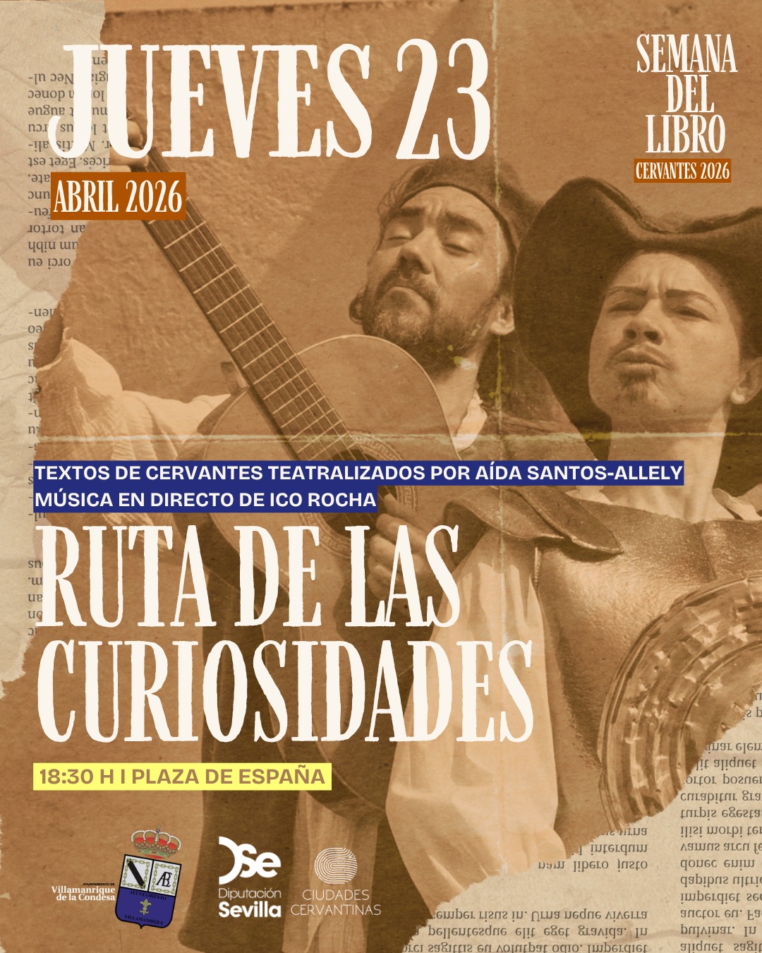 En el #diadellibro tiene lugar esta Ruta Teatral como homenaje a Cervantes en la Ciudad Cervantina de Villamanrique donde nuestro ilustre personaje estuvo como comisario real... Ruta interpretada por Aida Santos-Allely y con música en directo a cargo de Ico Rocha. Selección de textos cervantinos; entremeses, teatro, El Quijote...